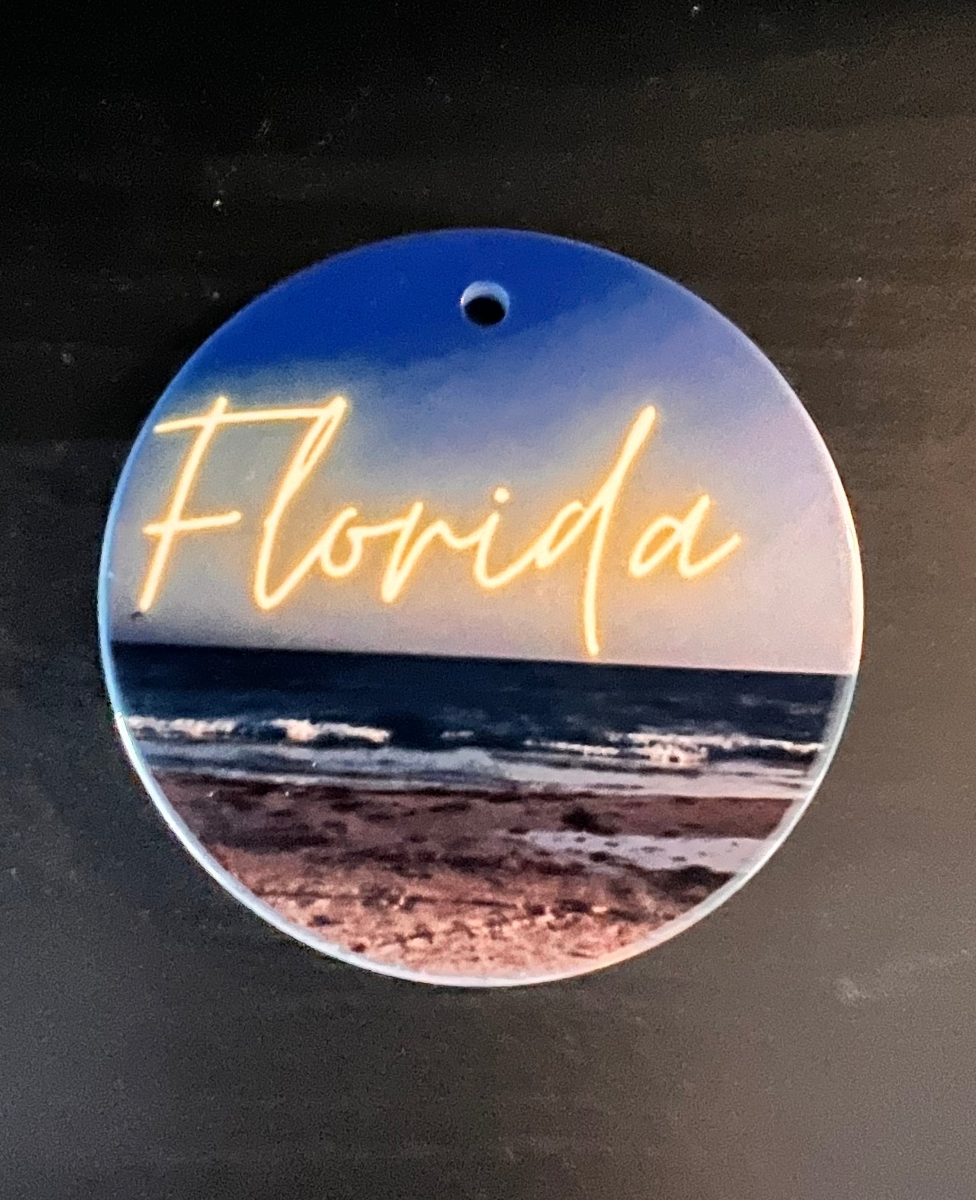 Round 3.9” Front side of the ornament is a shiny surface and the back is a matte finish. A satin ribbon is included.